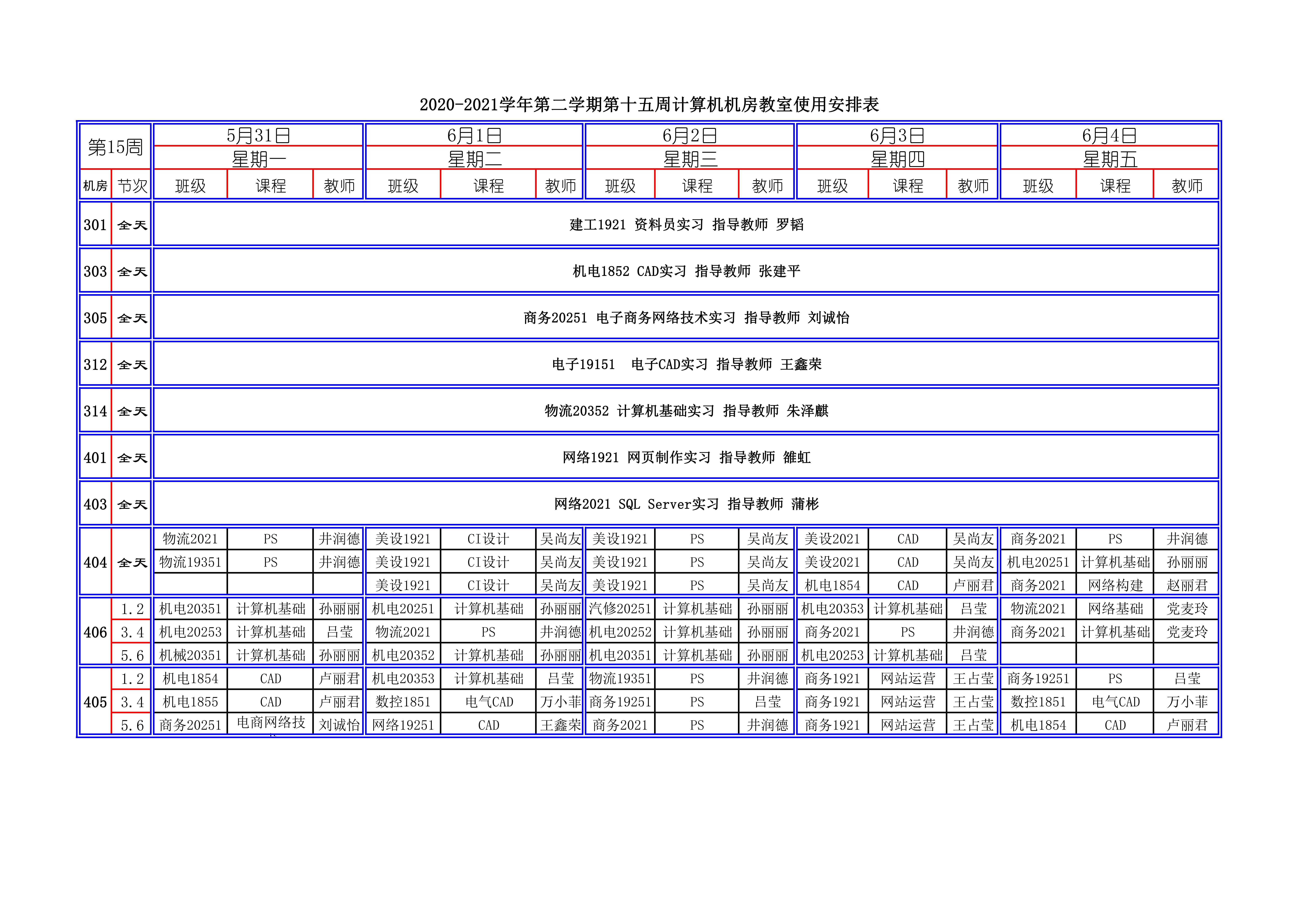 2020-2021學年第二學期第15周計算機機房教室使用安排表