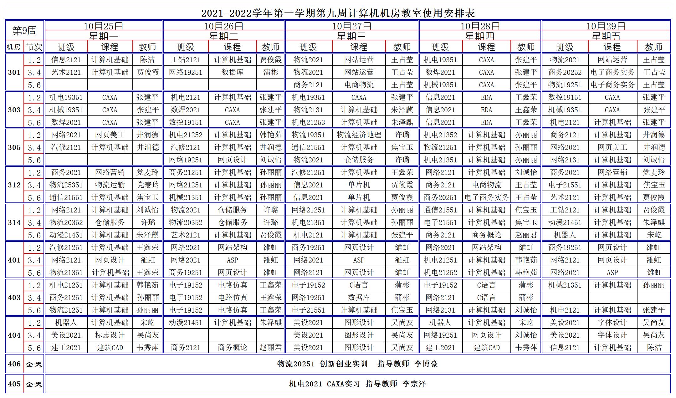 2021-2022學(xué)年第一學(xué)期第9周計(jì)算機(jī)機(jī)房教室使用安排表