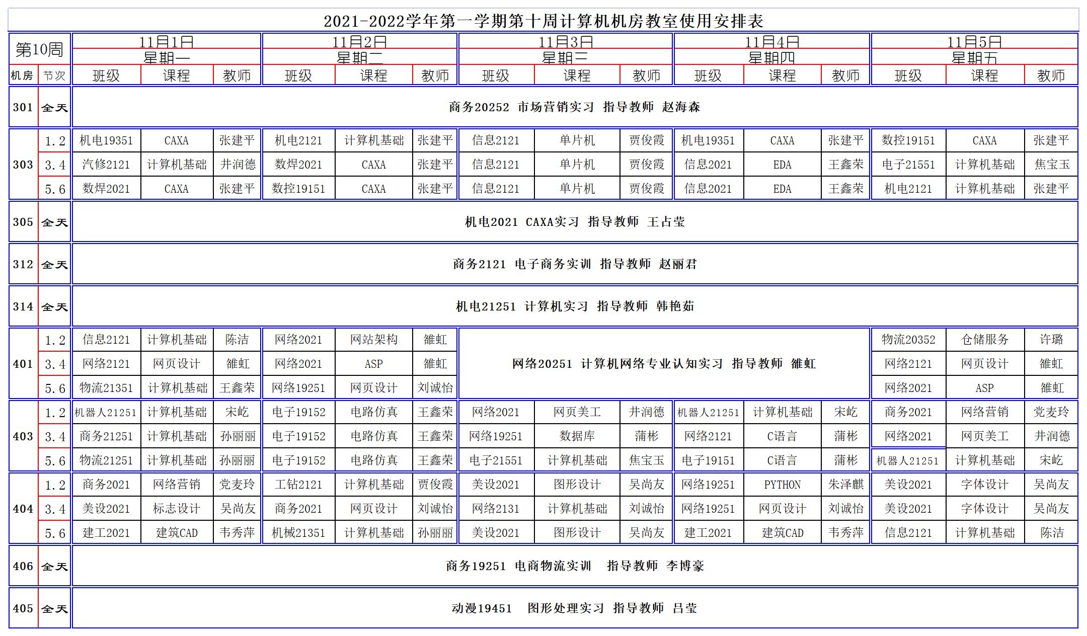 2021-2022學(xué)年第一學(xué)期第10周計(jì)算機(jī)機(jī)房教室使用安排表