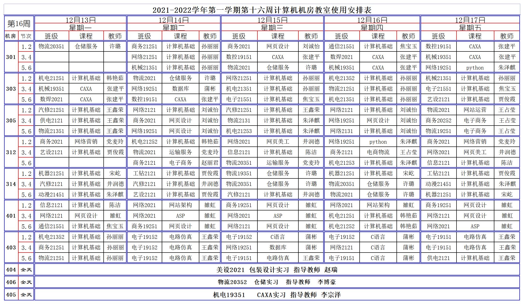 2021-2022學(xué)年第一學(xué)期第16周計算機機房教室使用安排表