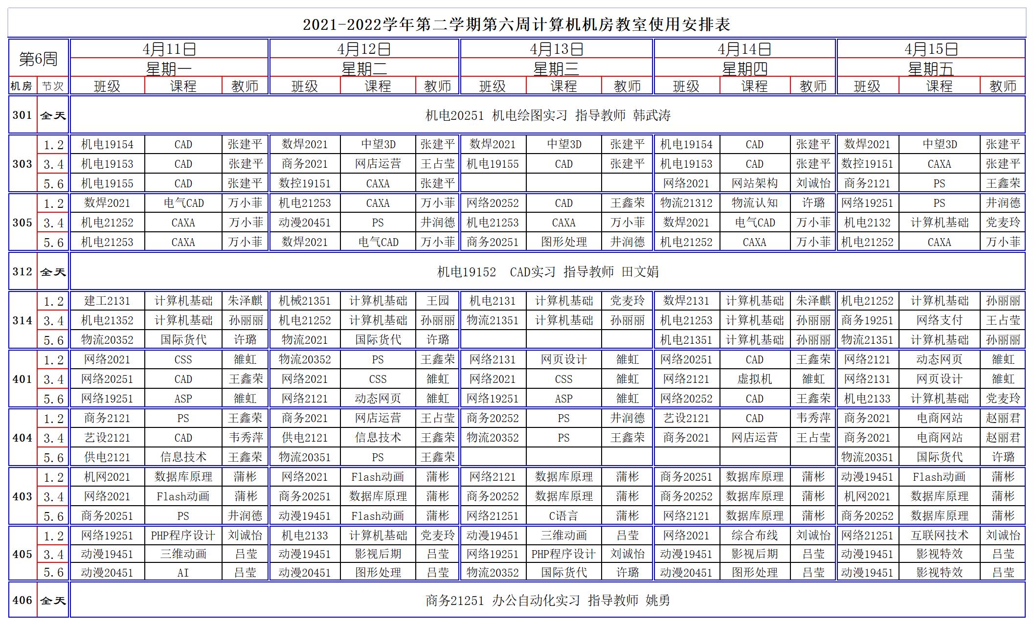 2021-2022學(xué)年第二學(xué)期第6周計算機(jī)機(jī)房教室使用安排表