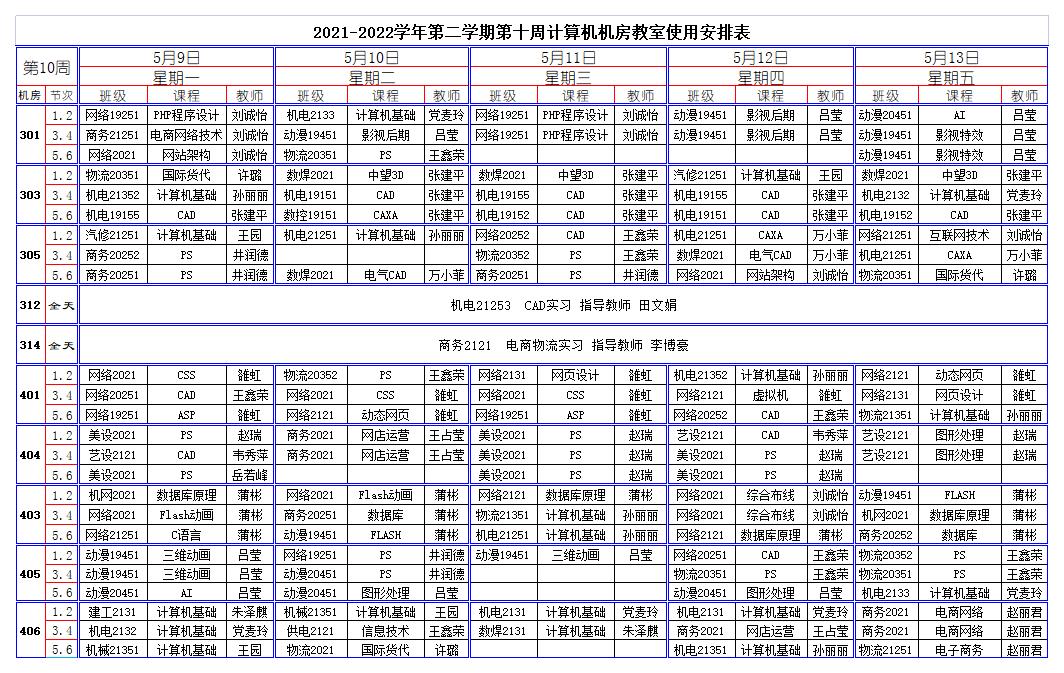 2021-2022學(xué)年第二學(xué)期第10周計(jì)算機(jī)機(jī)房教室使用安排表