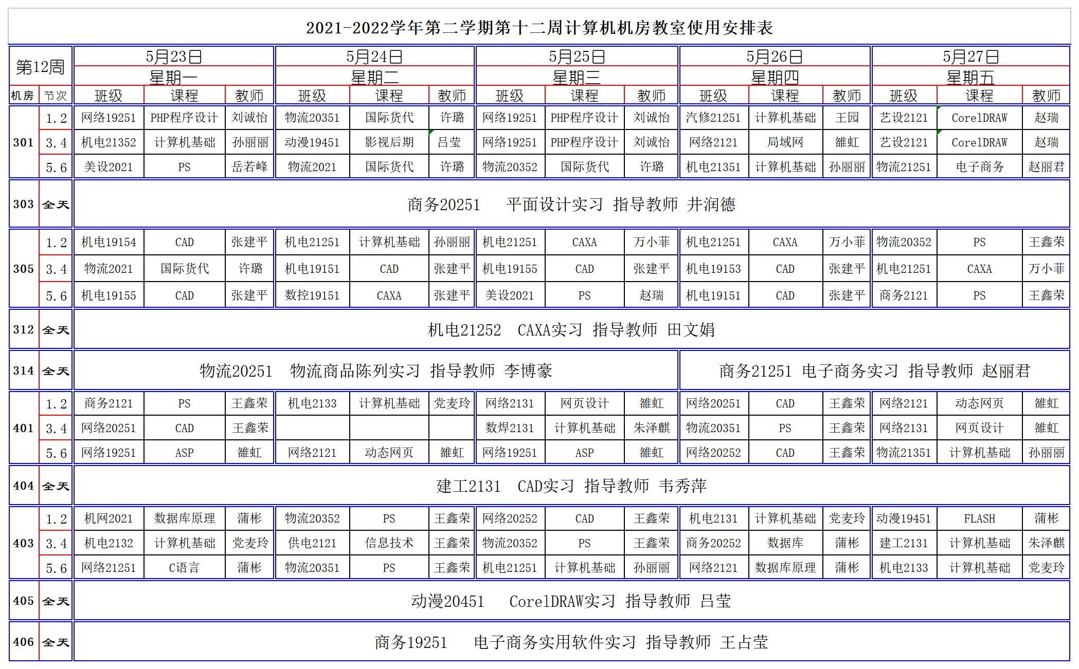 2021-2022學(xué)年第二學(xué)期第12周計(jì)算機(jī)機(jī)房教室使用安排表